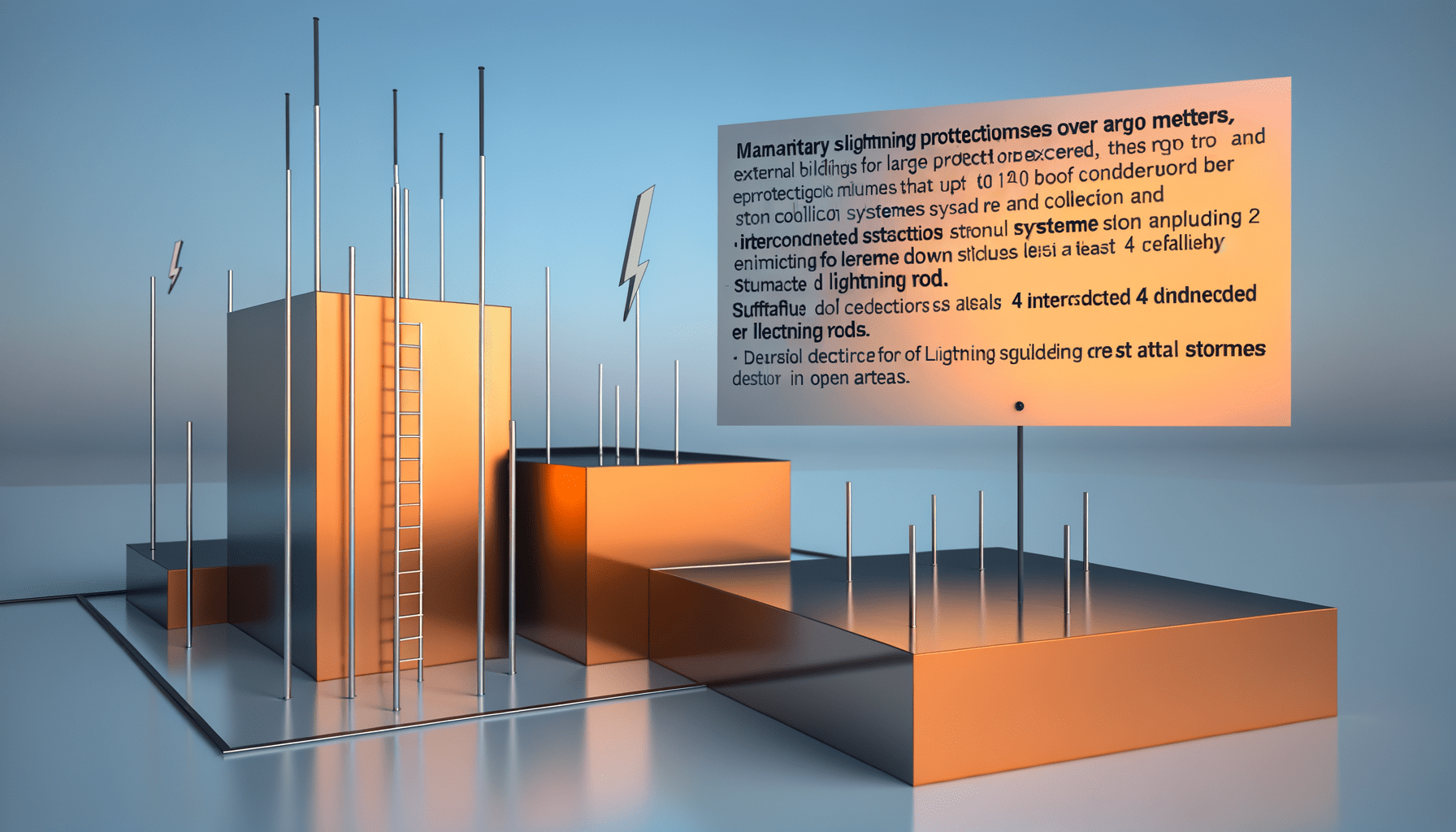 Para edificios con alturas superiores a 60 metros, es obligatorio instalar un sistema de protección externa contra el rayo. Este sistema debe proteger no solo la cubierta del edificio, sino también el 20% superior de la estructura contra impactos laterales. Las normativas consideran suficiente un sistema de captación de Nivel de Protección IV, pero es recomendable usar pararrayos con dispositivos de cebado, especialmente en edificios con terrazas o zonas irregulares en la parte superior.